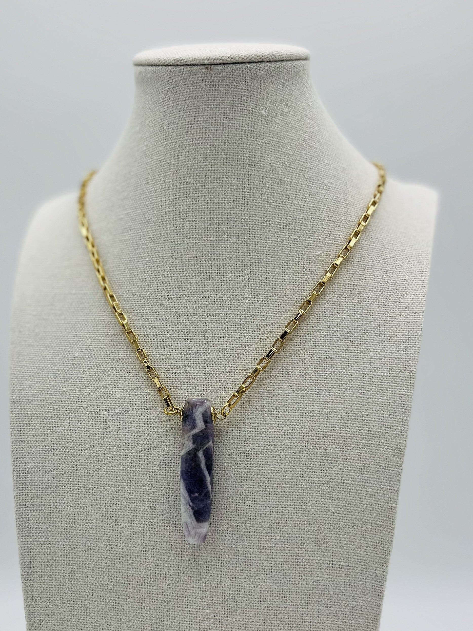 Colar unico que une a beleza da Ametista com o brilho elegante da corrente dourada